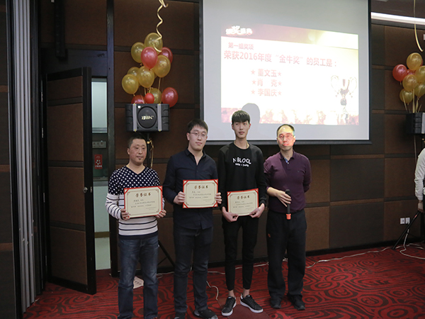 公司的發(fā)展離不開辛勤付出的員工,他們在各自崗位上盡職盡責(zé)、任勞任怨。經(jīng)投票及評定小組評定,公司在員工中選出有杰出貢獻(xiàn)的金牛獎(jiǎng)三名,金獅獎(jiǎng)三名,與一個(gè)金帆獎(jiǎng)優(yōu)秀團(tuán)隊(duì)。公司領(lǐng)導(dǎo)為優(yōu)秀員工頒發(fā)了證書和獎(jiǎng)品,鼓勵(lì)他們在新的一年可以繼續(xù)努力,起到模范帶頭作用,做出新的貢獻(xiàn)。